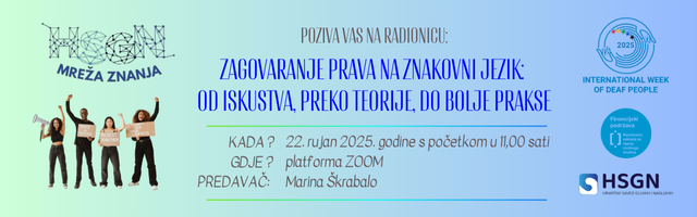 Mreža znanja Hrvatskog saveza gluhih i nagluhih je povodom Međunarodnog tjedna gluhih osoba 2025. organizirala online radionicu na temu „Zagovaranje prava na znakovni jezik: od iskustva, preko teorije, do bolje prakse“ 22. rujna 2025. godine putem Zoom platforme.